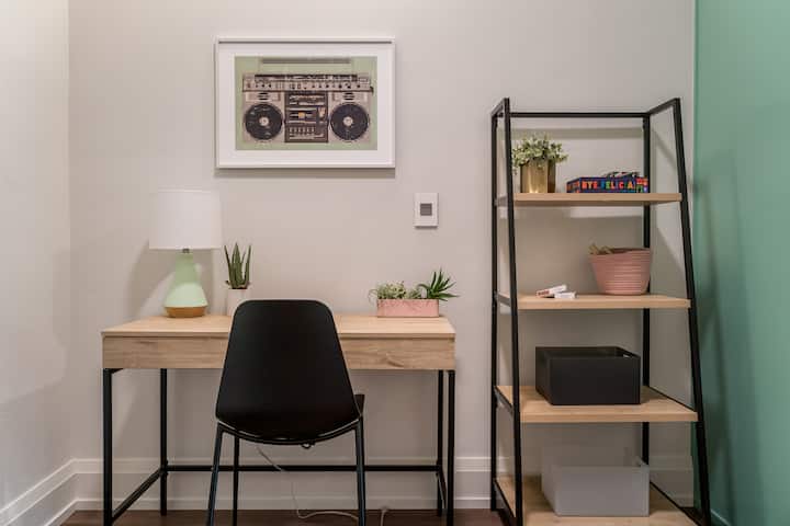 L'AMBIANCE au 505 Eugene ! Emplacement incroyable sur la 5e rue. Chaque centimètre est organisé professionnellement pour votre plaisir. Palette de couleurs tendance, luminaires simplistes et touches intemporelles. 2e étage, emplacement privé avec vue sur la ville. Cuisine complète avec four, micro-ondes, réfrigérateur, Keurig aux couleurs coordonnées (bien sûr), cafetière à piston. Matelas Queen Size super confortable dans la chambre avec porte coulissante privée. Plus un canapé-lit gigogne supplémentaire. Espace de travail de bureau dédié, plus coin repas. Télévision connectée 65" avec streaming et Wi-Fi rapide.
