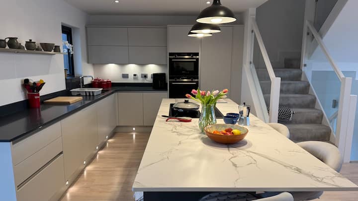 Cuisine – entièrement équipée avec deux fours électriques intégrés, micro-ondes, plaque à induction avec extracteur d’air. Un Quooker fournit de l'eau chauffée (100 °C) pour les boissons chaudes, donc pas de bouilloire fournie.