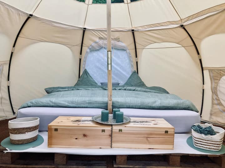 Notre confortable tente cloche Lotus Belle offre tout ce qui fait battre plus fort le cœur du camping-car ( et du glamour). Avec un diamètre de 4 m et 3 m de hauteur, il est possible de se tenir confortablement à l'intérieur. Le toit est transparent et permet une vue dégagée sur les étoiles.