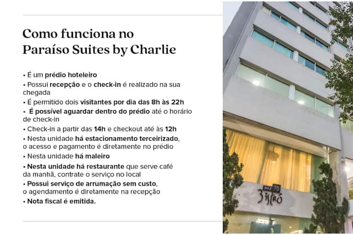 Bienvenue à Charlie, faites comme à la maison ! Dans Charlie, vous trouverez des appartements meublés et prêts à vivre, avec lit d'hôtel et trousseau, équipements exclusifs, mais nous ne sommes pas un hôtel. Que voulez-vous dire ? Nous sommes situés dans des bâtiments résidentiels où vous pouvez séjourner aussi longtemps que vous le souhaitez, 1 jour, 1 mois ou 1 an. Pendant votre séjour, si vous avez besoin de services supplémentaires ou de questions, il vous suffit de consulter le concierge en ligne 24h/24. Cadeaux à Sampa, RJ et POA !