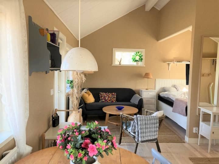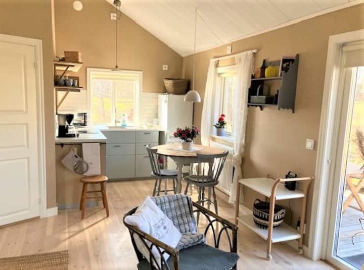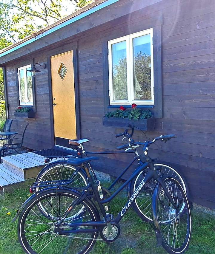 Nous vivons ici depuis de nombreuses années. Håkan est à la retraite et je dirige une boutique d'occasion dans le port. Nous avons travaillé avec le tourisme dans le passé dans des entreprises communes et construit un village de cabanes pour une période de 20 ans. Ce chalet est conçu et construit par nous, nous voulions créer de l'espace et des équipements malgré une superficie limitée de 30 m ². Avec des choix de couleurs et un toit de sedum », le chalet se fond dans l'environnement de la prairie de plage et de roseau.