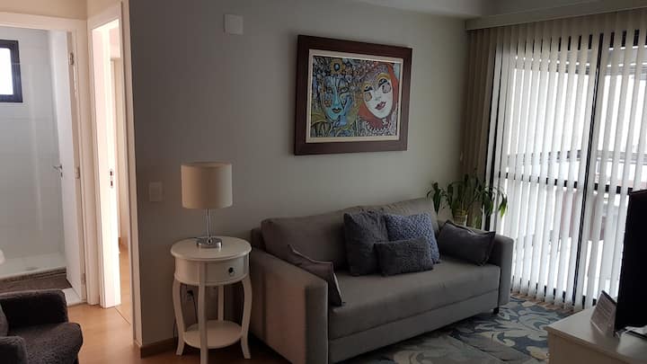 Studio de 37m² composé d'une cuisine/salon/chambre intégrée, d'un balcon, d'un soleil de l'après-midi, d'une excellente lumière naturelle, bien ventilé. Proche du parc Barrigui, l'une des régions les plus sûres de Curitiba Peut accueillir confortablement 02 personnes.