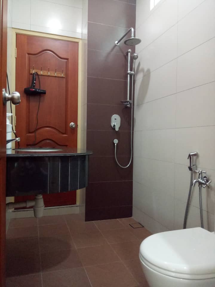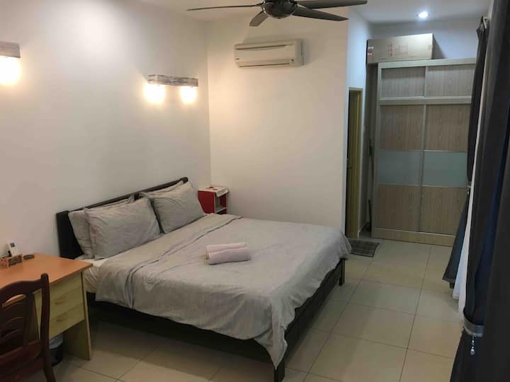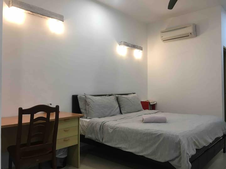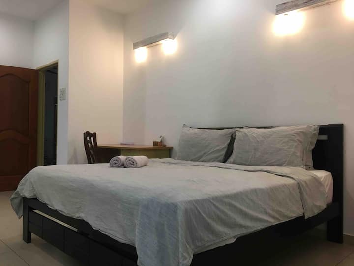 Chambre avec lit king-size et salle de bain attenante. Elle peut accueillir confortablement deux personnes et est située dans une rue calme. C'est un endroit adapté aux voyageurs qui souhaitent se promener et explorer la ville d'Ayer Itam.