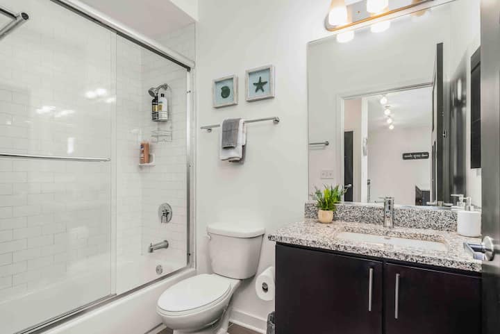 Chaque chambre dispose d'un lit Queen Size avec des stores occultants. Le lit principal dispose d'une salle de bain privée complète, et chaque chambre est décorée pour une atmosphère accueillante lorsque vous êtes loin. La deuxième salle de bain dispose d'une baignoire si vous souhaitez prendre un bain bouillonnant. Il y a un lave-linge/sèche-linge dans le logement pour nos voyageurs qui séjournent plus longtemps, ou si vous avez besoin d'un lavage rapide de votre tenue préférée.
