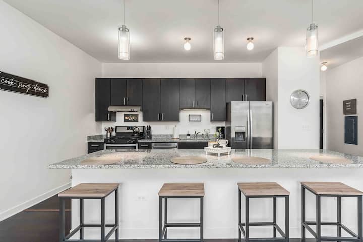 Lorsque vous entrerez dans ce spacieux logement Airbnb, vous adorerez l'aménagement ouvert et la quantité de lumière naturelle qui entre. Si vous ne vous souciez pas de la lumière, vous pouvez baisser les stores occultants pour les éloigner. Il y a une énorme île pour manger, boire un café et se réunir avec vos compagnons de voyage.
