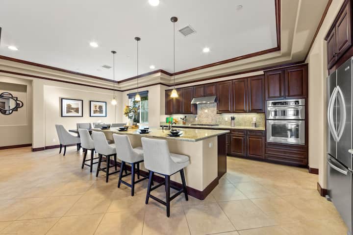 Cette maison de vacances s'ouvre sur un salon spacieux avec une cuisine gastronomique. Il y a beaucoup de place dans le salon pour se détendre devant une télévision Samsung 4K de 75 pouces avec confort et un ventilateur de plafond télécommandé. La salle à manger décontractée dispose d'une table avec des chaises pour six personnes. La salle à manger dispose de sièges supplémentaires pour six personnes. La cuisine entièrement équipée dispose de superbes appareils en acier inoxydable tels qu'un réfrigérateur à porte française Kitchen-Aid. Il offre tout ce dont on aurait besoin pour créer leur repas parfait, y compris des plans de travail en granit et des restaurants à hauteur de bar avec des sièges pour quatre personnes. Les épices, condiments ou huiles ne sont pas fournis.