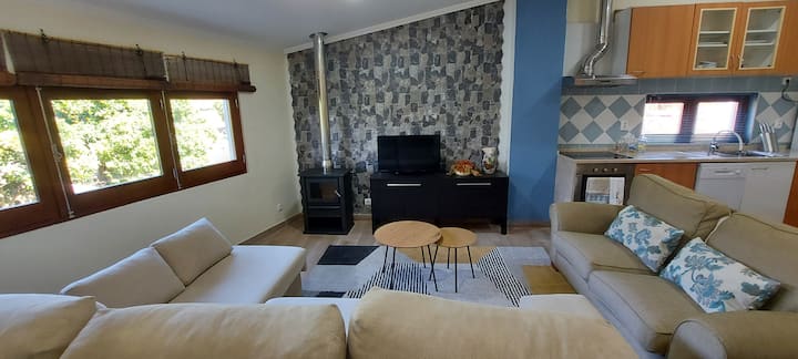 Le logement d'hôtes est un appartement au rez-de-chaussée avec 60m2. Il dispose d'une chambre, d'un grand salon avec coin repas et kitchenette bien équipée pour les besoins d'une petite famille et d'une salle de bain avec douche. Le salon dispose d'un poêle à bois, pour les journées d'hiver, et d'une puissante unité de climatisation, qui réchauffe en hiver et rafraîchit en été.