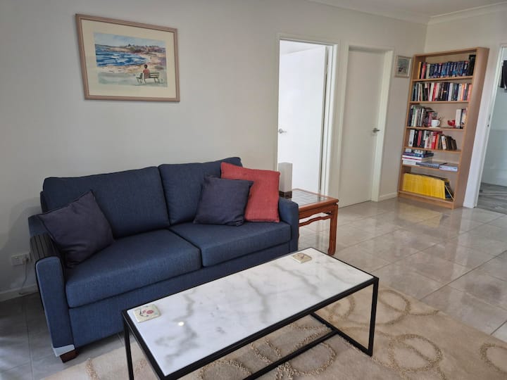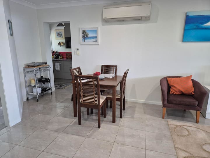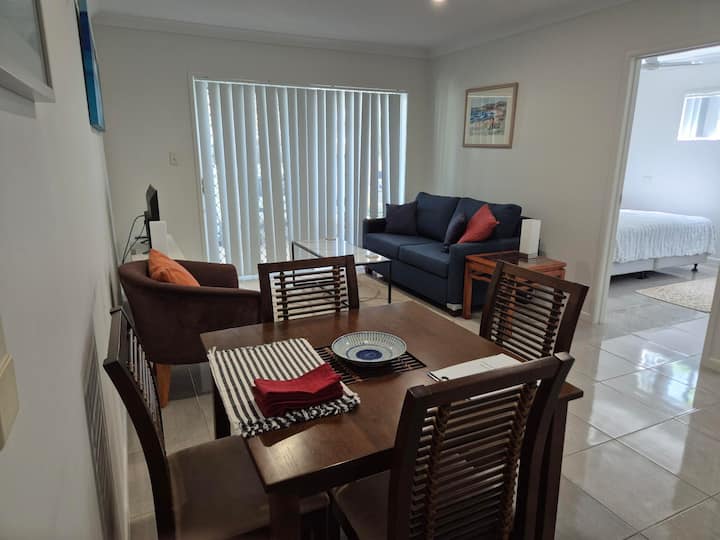 Bienvenue dans notre maison et sur la belle Sunshine Coast. L'espace est idéal pour une ou deux personnes partageant une chambre ou utilisant les deux chambres. Le logement dispose d'une bonne sécurité avec des portes et des fenêtres moustiquaires. Il y a une porte attenante à la maison qui est verrouillée des deux côtés afin que vous ayez votre intimité et nous avons la nôtre. Il y a des sièges couverts à l'avant pour manger ou se détendre. La cuisine est bien équipée, mais sachez qu'il n'y a pas de cuisinière complète - une plaque de cuisson à deux plaques, un micro-ondes, une poêle électrique, un grille-pain, une machine à café, un cuiseur à œufs, un grille-pain, une bouilloire et un réfrigérateur de taille moyenne avec congélateur. Il y a un barbecue à gaz avec une plaque de cuisson à gaz à l'extérieur de la porte arrière pour votre usage exclusif. Dans la cuisine, vous trouverez une sélection de thés et une machine à café ainsi que du lait et du sucre. Il y a un lit queen confortable dans la chambre deux et un lit king dans la chambre un. Nous fournissons tout le linge de qualité : serviettes de bain et de plage, draps, oreillers et glissades, doonas pour l'hiver et couvertures en coton pour l'été. Nous fournissons des peignoirs et des pantoufles confortables pour vous détendre. Les torchons et les serviettes de toilette sont dans la cuisine, ainsi que des serviettes en papier et des serviettes. Il y a également un accès à la buanderie partagée avec lave-linge et sèche-linge - instructions d'utilisation à côté du détergent, etc. Stationnement couvert dans l'abri pour un véhicule. Veuillez indiquer si plus d'un véhicule lors de la réservation. Une douche extérieure pour laver le sable après la plage se trouve à gauche de l'abri pour voitures. Veuillez noter qu'avec le Covid19, nous effectuons un nettoyage en profondeur et laissons 24 heures entre les réservations. Le nettoyage en profondeur consiste à laver tout le linge à 90 degrés, essuyer et laver toutes les surfaces avec du désinfectant. Nous nous ferons un plaisir de répondre à vos questions concernant le nettoyage, etc. Nous sommes également heureux de proposer des options de restauration, touristiques, de pêche, de shopping, de vélo ou de marche.