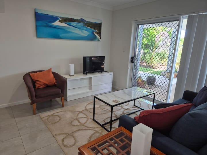 L'appartement de deux chambres fait partie de notre maison. Nous vivons à l'étage et l'appartement est en bas. Vous avez votre propre accès avec une porte coulissante en verre à l'avant et une porte à l'arrière, toutes deux avec des portes moustiquaires sécurisées. Il y a un éclairage extérieur à l'avant et à l'arrière des entrées. Veuillez laisser l'interrupteur du bas allumé aux portes avant et arrière 24 h/24, 7 j/7. Une place de stationnement couverte est disponible. L'aéroport de Sunshine Coast est à environ 30 minutes de notre maison (taxi environ 40 $ à 47 $ - Uber environ. $ 30-$ 40 - ConXion porte à porte (les prix dépendent de l'heure de la journée - réservez en ligne). Notre logement est accessible en train et en bus depuis Brisbane City ou l'aéroport de Brisbane - consultez Translink pour connaître les horaires . L'arrêt de bus se trouve à 10 minutes à pied de notre maison depuis l'arrêt de bus Meta Street sur Mooloolaba Boulevard. Il y a un service de bus de porte à porte depuis l'aéroport de Brisbane - 55 $ aller simple - 99 $ aller-retour - Services de transfert ConXion depuis l'aéroport de Sunshine Coast - aller simple et retour dépend de l'heure de la journée et de l'aéroport de Brisbane - veuillez réserver en ligne 24 heures avant l'arrivée.