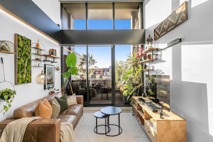 Imaginez votre prochaine escapade urbaine dans un loft urbain unique, inspiré de la nature, à plusieurs niveaux avec une piscine à débordement chauffée, du linge de maison de luxe, une salle de sport de taille généreuse, des appareils électroménagers haut de gamme et une mini bibliothèque, et qui est à une minute à pied du port, de Woolworths et d'un centre commercial en plein air. Tout cela tout en ayant un parking gratuit et des tramways gratuits pour le CBD s'arrêtant juste à votre porte !