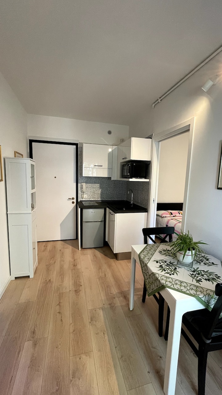 •) entrée avec kitchenette (équipée d’un réfrigérateur avec congélateur, plaque de cuisson à induction, four à micro-ondes, casseroles, couverts et vaisselle, huile, sel et vinaigre balsamique en monodose, machine à café Nespresso et pour cappuccino, sucre, dosettes) et un espace détente (table avec 2 chaises, télévision, bibliothèque)