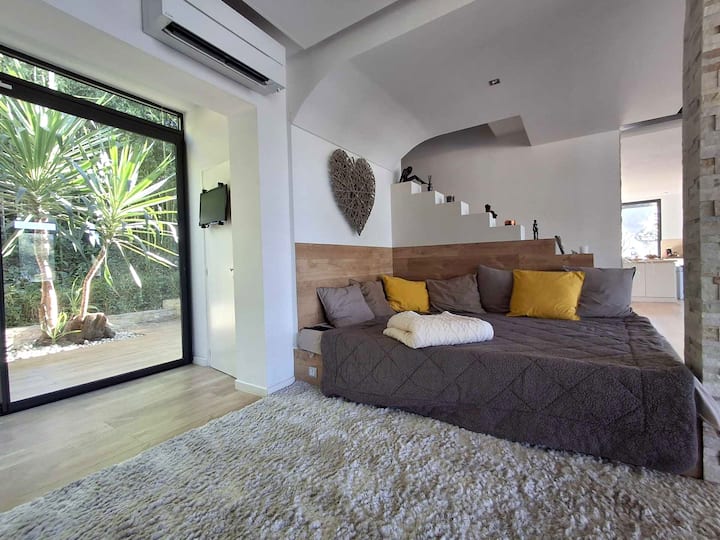 - Une suite parentale avec lit queen size (160x200cm), dotée d'une salle de bain avec douche , de toilettes séparées et d'un dressing, s'ouvre directement sur le jardin et la piscine.