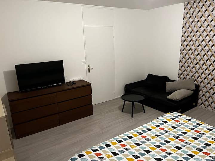 Chambre18m2 avec grand lit 2x2m +mini salon et TV