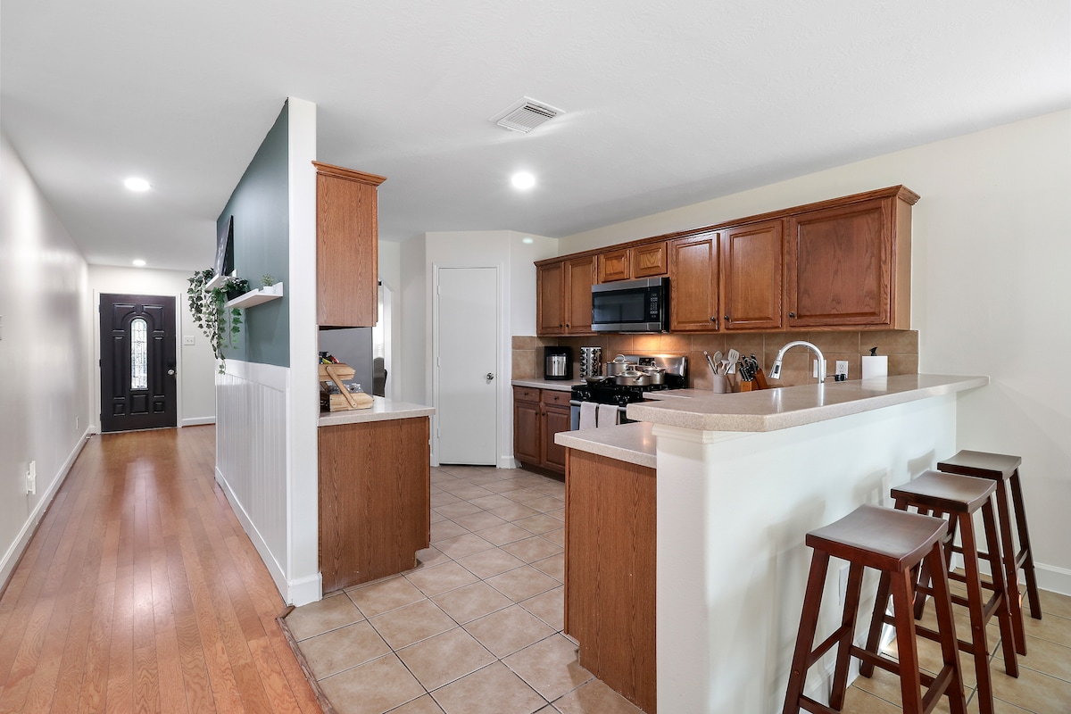 Découvrez la différence que le design peut faire dans notre maison personnalisée que nous avons conçue et construite pour nos voyageurs ! 1800 pieds carrés, 3 chambres, 2 salles de bain, 14 couchages ! Au cœur de Chinatown, accès immédiat à Westpark Toll & Beltway 8. Adapté aux bébés/enfants/animaux ! Tous les éléments essentiels/commodités inclus : cuisine entièrement équipée, 2 lits King Size, téléviseurs dans toutes les chambres, literie/linge de maison haut de gamme, collations/boissons gratuites, articles de toilette, espace de travail dédié, lave-linge séchant, ports USB partout, Wi-Fi ultra rapide et Netflix, Hulu, Disney+, ESPN+ !
