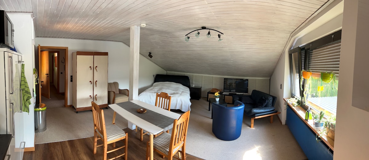 L'appartement mansardé baigné de lumière (1er étage) est situé au calme dans une rue latérale et offre ainsi une pure détente ! Vous pouvez nous rejoindre depuis l'autoroute A44 en seulement 10 minutes. Dans la cour d'école à côté avec une structure d'escalade et un espace pour jouer au ballon, les plus petits peuvent se défouler. Un parking est à votre disposition devant la porte d'entrée. Dans le village se trouvent un restaurant, un terrain de golf et un terrain de mini-golf. En outre, le parc animalier local est passionnant pour petits et grands. Merci de ne pas fumer