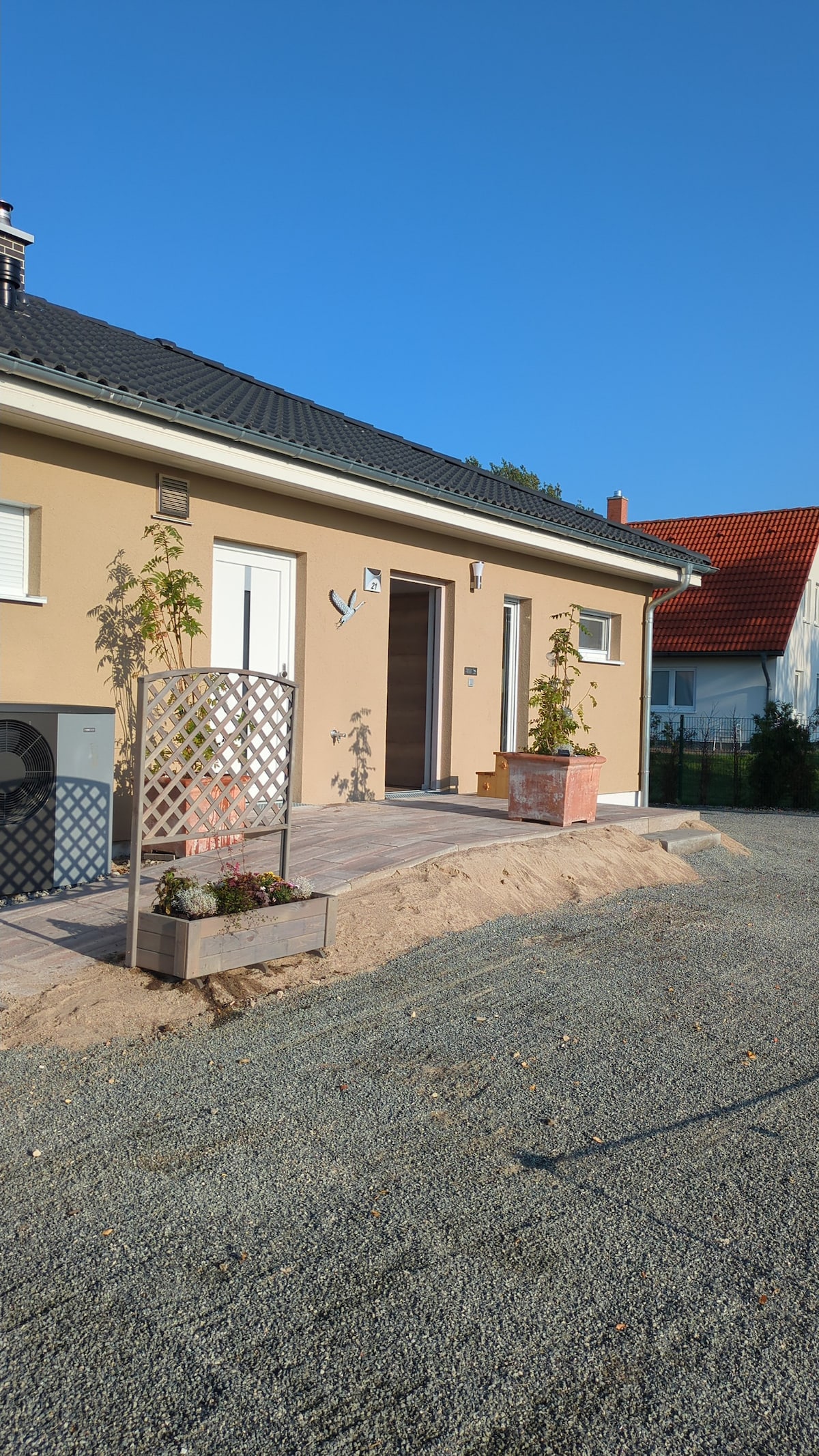 ... regardez de votre lit sur l'eau, profitez du calme et de la tranquillité et écoutez le bruissement de la forêt de hêtres, faites des excursions à vélo directement sur l'eau et profitez de la nature. Une belle maison à colombages moderne et rustique à faible consommation d'énergie avec toit de chaume, carreaux marocains, planchers de chêne et murs en plâtre d'argile vous attend. Pour les activités, il y a un beau grand jardin avec une balançoire dans la forêt, un sauna à vapeur gratuit, une douche et une baignoire extérieures, une planche de paddle, un pédalo et 4 vélos.