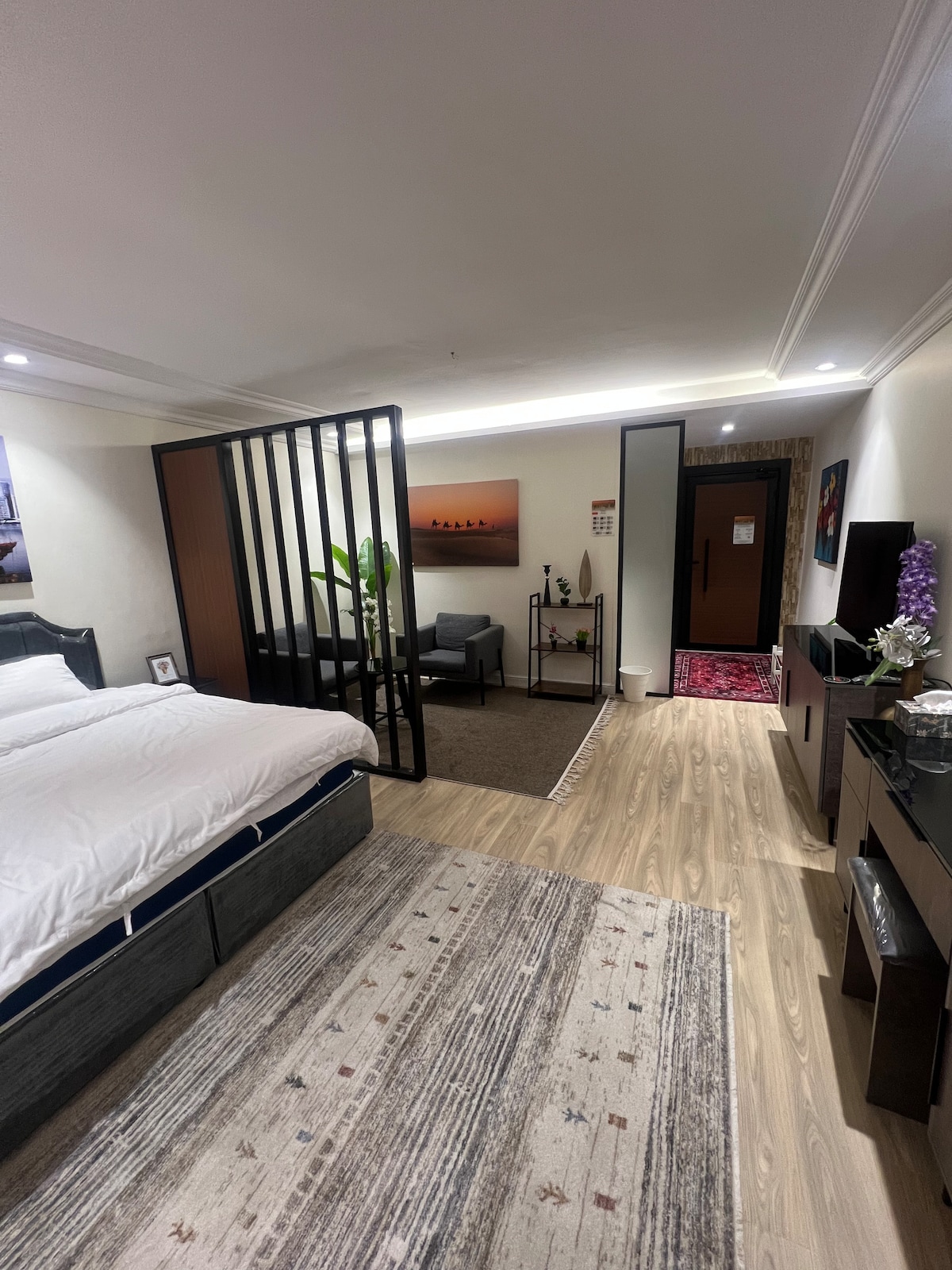 Détendez-vous dans ce logement calme et élégant. Suite de luxe avec vue panoramique complète sur le jardin avec des mûriers, des roses, des roses et des raisins, un service d'entrée intelligent en plus d'un grand écran moderne avec la technologie UHD 4K avec un abonnement au service iptv, toutes les chaînes du monde en plus des chaînes Bein Sports, Saudi Sports, showtime, Netflix et tous les films et séries, (( et la Coupe du Monde😍)) Il y a une mosquée près de la résidence. Et à proximité du parc Al-Radf, des restaurants, des marchés et des cafés de luxe. Il y a un guide touristique pour fournir aux clients tous les endroits qui méritent d'être visités.