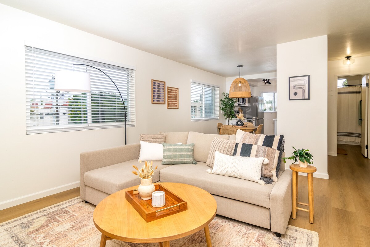 Bienvenue dans notre condo bohème de 2 chambres et 1,5 salle de bain récemment rénové, situé à seulement 1 pâté de maisons de Sail Bay dans le magnifique quartier de Crown Point à Pacific Beach, San Diego. Avec un accès à pied à Sail Bay (1 pâté de maisons), Pacific Beach (7 pâtés de maisons), aux restaurants locaux, aux bars et aux attractions, c'est la location de vacances idéale pour les familles, les couples, les travailleurs à distance ou les groupes d'amis. À moins de 15 minutes en voiture, vous trouverez Sea World, le zoo de San Diego, le centre-ville de San Diego, La Jolla, la vieille ville et bien plus encore !