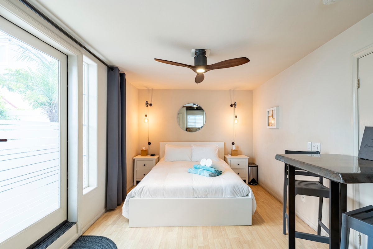 Studio confortable avec patio privé, cheminée intérieure et grand feu de gaz extérieur instantané. À 50 pas de l'océan Pacifique, de Mission Bay et du spa Catamaran. Profitez de la plage avec des vélos et des chaises de plage. Situé dans le très recherché North Mission Beach. Courte promenade en bord de mer jusqu'à Pacific Beach, des tonnes de restaurants et de boutiques ! Yelp répertorie 86 restaurants avec des critiques de 4 étoiles et plus accessibles à pied. WiFi 400 Mbits et streaming Netflix, Amazon Vidéos,