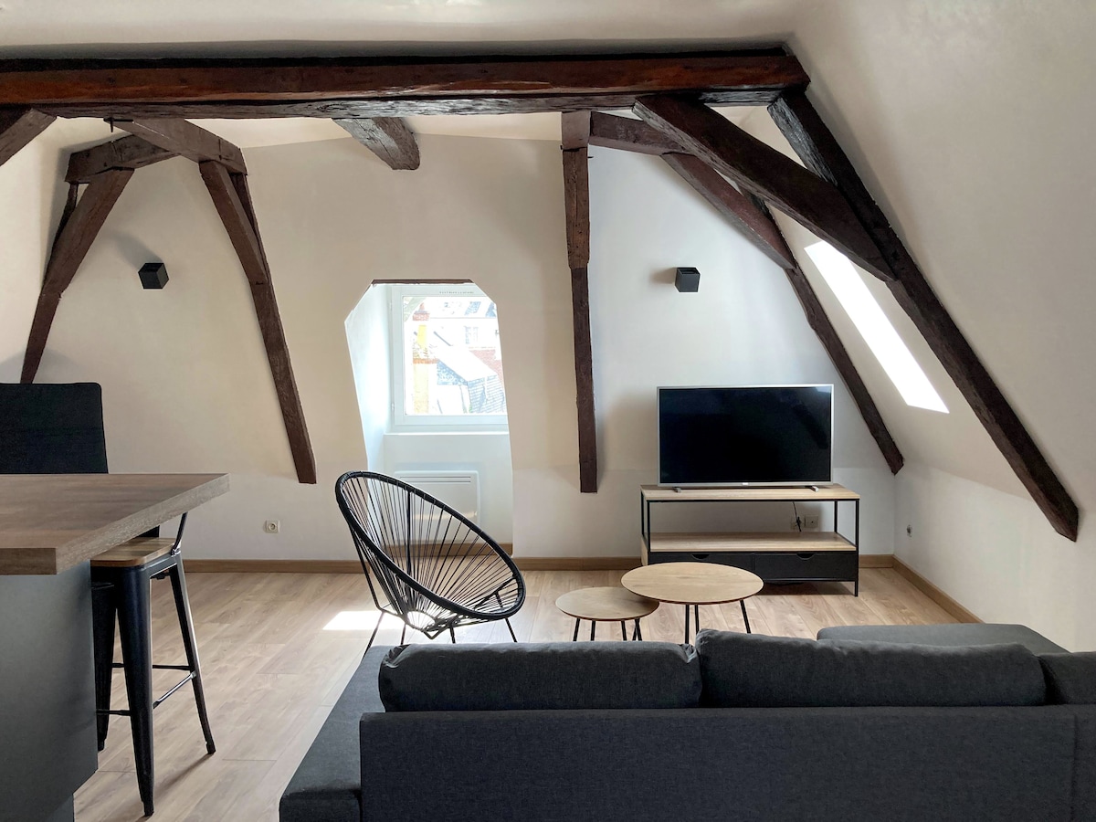 Intérieur moderne dans un immeuble ancien. Belle charpente, rénovation récente. Bel espace de vie, au calme tout en étant en plein centre ville .Stationnement autour facile ,parking attenant ou grand parking gratuit à 100 m , très rare avec le nouveau plan de circulation !. Proche de commerces (petit supermarché,boulangerie ,pharmacie ,) au pied de la Cathédrale . Proche du centre de formation de La Défense (CFD) et de la Maison de la Culture.Proche de Sancerre ( village préféré des Français)