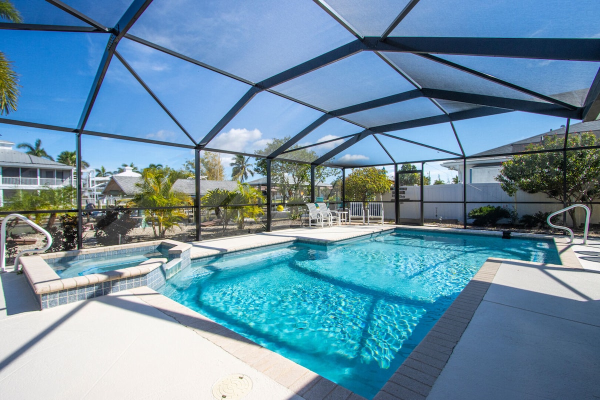 À quelques minutes de l'océan, 2 BR + Den, 3 salles de bain, piscine privée, extrémité du canal Monroe, remontée mécanique jusqu'à 21 pieds, observer les dauphins, pêcher directement sur le quai, kayaks, promenade en bateau à seulement quelques minutes de Sanibel et Fort Myers Beaches, tous les équipements de la maison + jeux de société, Playstation, 2 vélos adultes avec casques. Détendez-vous, profitez du plein air ensoleillé avec un bar et une terrasse privée de la piscine – admirez les couchers de soleil, sirotez des cocktails, repérez des dauphins, du poisson sur les quais. Venez profiter de la vie au bord de l'eau à son meilleur !