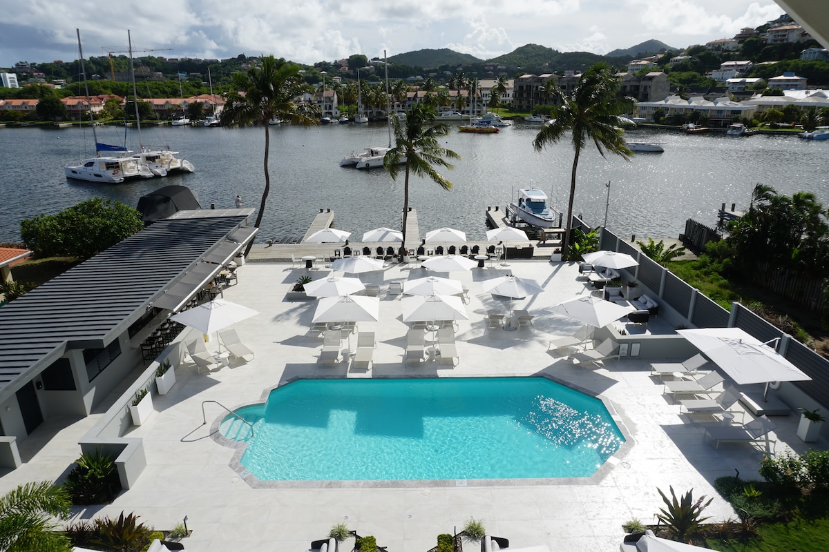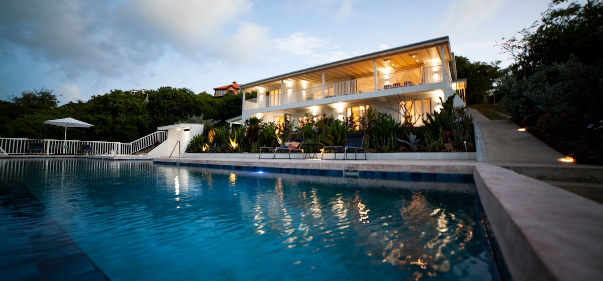 Tout le niveau inférieur d'une villa moderne nouvellement construite avec concierge, située à l'extrémité nord de l'île, sur le prestigieux domaine Cap, avec une vue imprenable sur l'océan et l'île voisine Martinique. Ce logement de 2 chambres dispose d'une véranda, d'un espace vert, d'un salon et d'une cuisine entièrement équipée. Détendez-vous près d'une magnifique piscine à débordement de 65 pieds (20 m) de long et d'un foyer encastré. Villa Imuhar offre un attrait hôtelier avec une sensation de maison avec la possibilité d'une cuisine et de repas à temps plein préparés pour votre palais