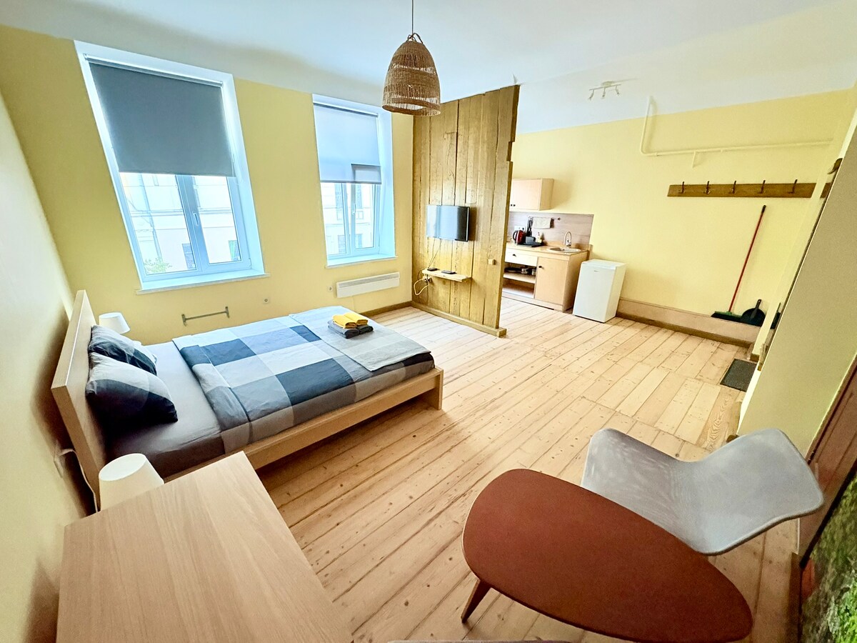Charmant studio flambant neuf avec entrée privée au parc situé en plein centre-ville sur la rue Caka. Conçu avec élégance et détails modernes, ce studio est chaleureux, ensoleillé et très calme. Pourtant, derrière les portes, vous trouverez une rue animée avec des cafés, des boutiques et des supermarchés. Vous êtes en plein centre de Riga ! La « vieille ville » est à moins de 3 km ou à quelques arrêts de transports en commun disponibles à votre porte. Parfait pour le travail ou les loisirs, il peut accueillir jusqu'à 2 personnes.
