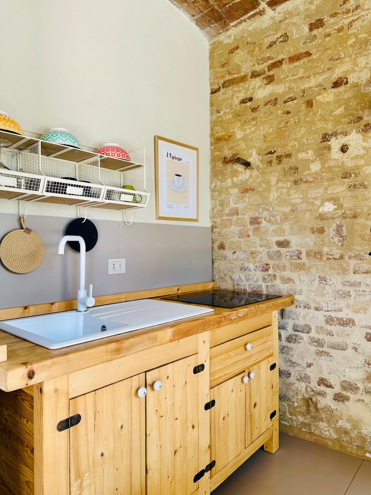 Cet appartement spacieux de 100 m² avec ses 2 chambres avec salle de bain attenante dispose d'éléments anciens comme des plafonds voûtés et des sols en pierre d'origine. Il y a une cuisine ouverte entièrement équipée avec un salon spacieux et de nombreux sièges pour 4 personnes. L'appartement est équipé d'un coin salon extérieur dédié sous le vieil olivier d'où vous avez une vue spectaculaire sur les vignobles et le château de Moasca. En outre, il y a également un coin petit-déjeuner privé avec vue sur la piscine.