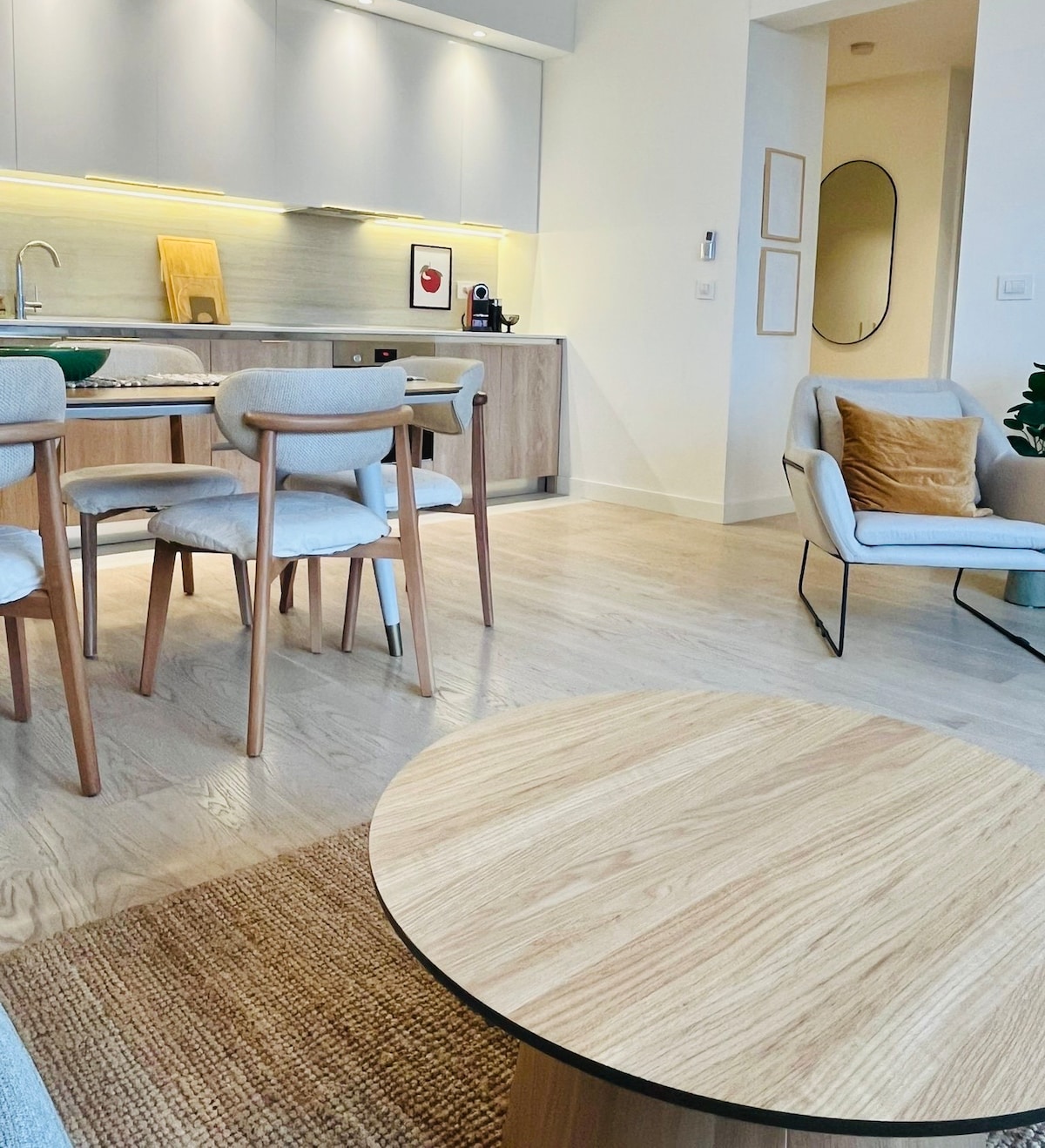 L'appartement est entièrement rénové il y a quelques mois et tout est neuf. Dans la chambre, il y a un grand lit double confortable et un grand canapé-lit dans le salon. Le tout en lumière LED discrète. Dans la cuisine, vous pouvez profiter d'une cuisinière à écran plat moderne, d'un four, d'un réfrigérateur avec congélateur, d'un lave-vaisselle et d'un lave-linge et d'une grande table de bar. La salle de bain est vitrée avec des céramiques en marbre, elle est très compacte et propre. La salle de bain est équipée d'un sèche-cheveux, de serviettes, d'ensembles d'hygiène.