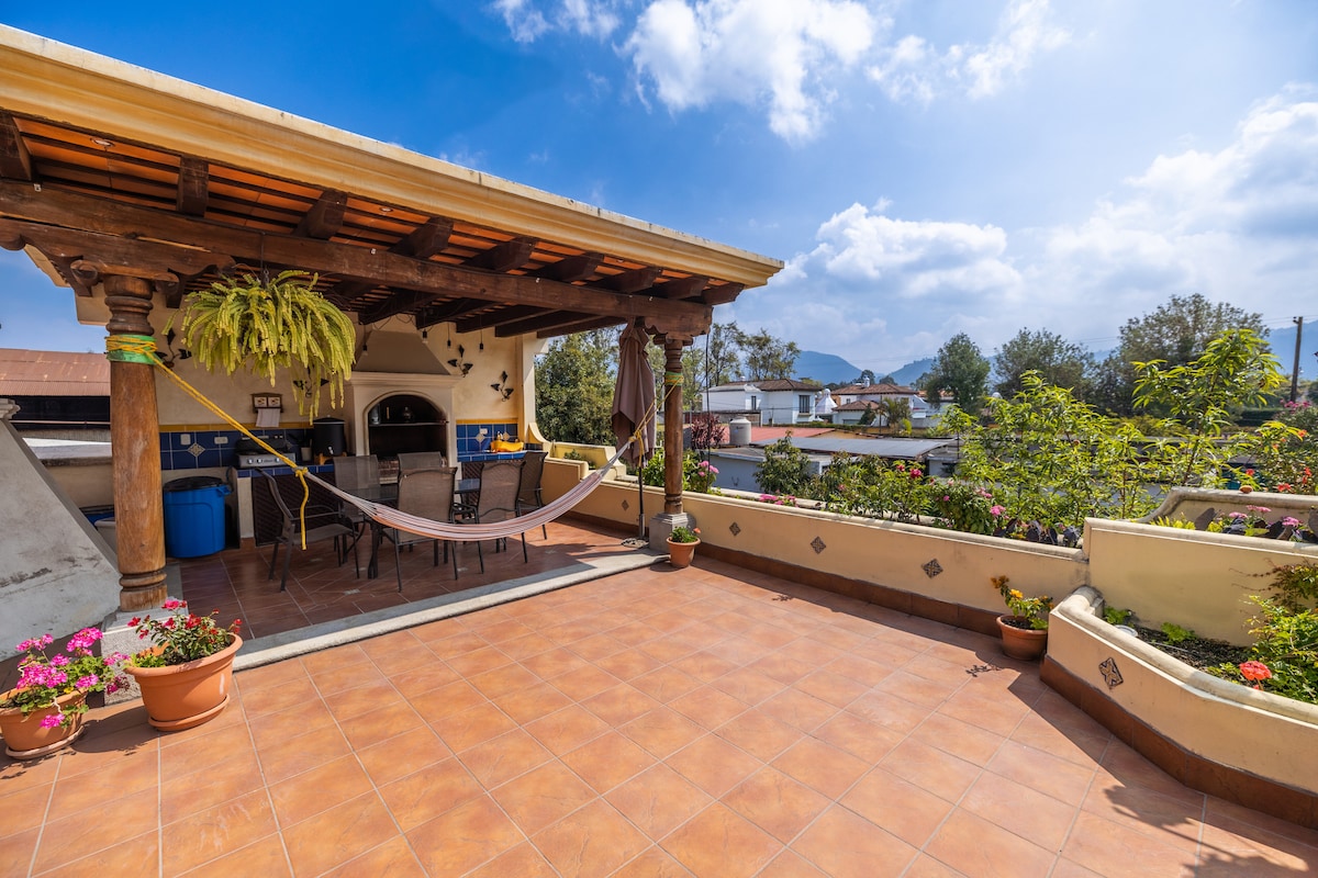 Profitez de cette charmante villa, entourée de beaux jardins, pleine de paix, profitez du chant des oiseaux lorsque vous vous réveillez et du son de l'eau des fontaines qui l'entourent. Le matin, la piscine chauffée est l'option avant d'aller se promener à Antigua. Quelque chose de bien est de demander à allumer un feu et de le partager avec la famille. Située dans un complexe exclusif, hors de la circulation, idéale pour se déconnecter du monde, et juste vivre et rêver.