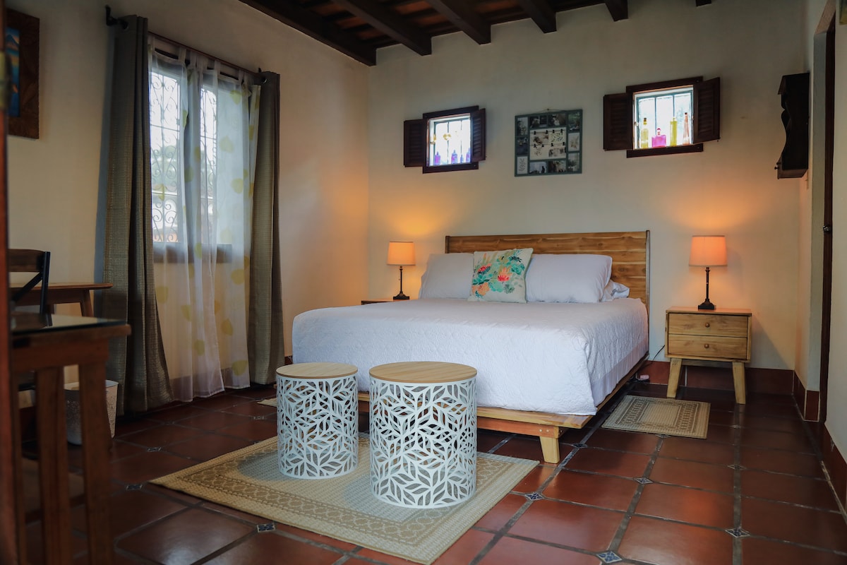 À quelques minutes en voiture du cœur d'Antigua, notre studio privé offre un refuge paisible en pleine nature. Réveillez-vous avec des jardins luxuriants et une vue dégagée sur le volcan à votre porte. Cet espace, parfait pour les couples ou les voyageurs en solo, offre un confort moderne avec une touche de charme local. Reposez-vous dans un lit confortable et profitez d'un petit-déjeuner fait maison dans la kitchenette. Pour un séjour tranquille avec la nature à votre porte, vous avez trouvé l'endroit idéal !