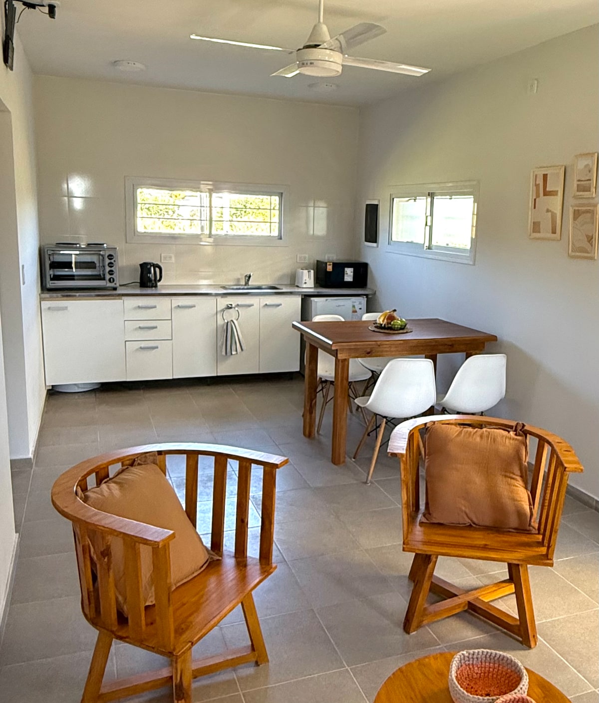 Son solo 4 cabañas iguales, separadas entre sí. C/u tiene 2 habitaciones, 1)cama 2 plazas, 2) con 2 camas 1 plaza somier. En el comedor hay una cama marinera. Equipadas con lo necesario para su estadía: heladera, microondas, horno a gas, pava eléctrica, utensillos, etc Aire Condicionado en comedor y LCD de 32"; Calefacción a gas o eléctrica; Estacionamiento privado bajo pergola/galería; Parrilla/Churrasquera individual; Piscina exterior compartida. Cámara de seguridad exterior