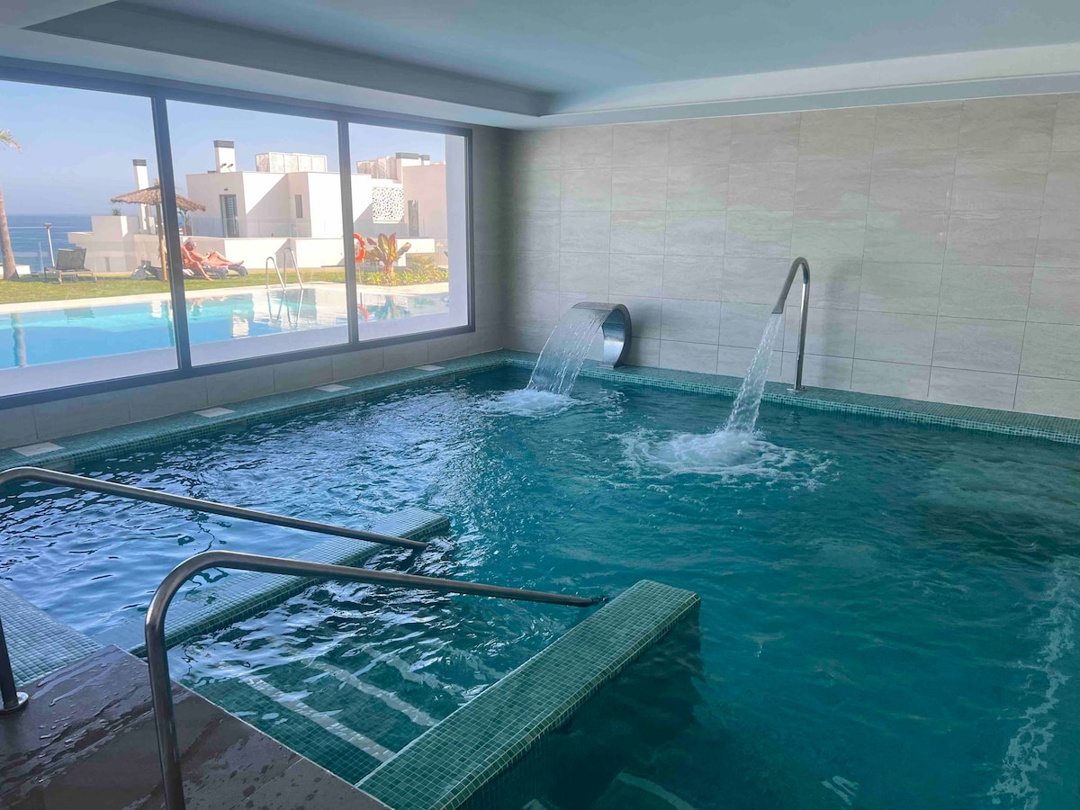 Agréable appartement moderne situé à côté du parcours de golf La Hacienda offre une vue panoramique unique sur Gibraltar et la baie avec un phare. L'appartement dispose de deux chambres, de deux salles de bain et d'une cuisine entièrement équipée. Vous pourrez garer votre véhicule dans le garage. L'appartement dispose d'un jardin avec une terrasse couverte, où vous pourrez vous détendre en toute intimité. Une piscine communautaire et une piscine pour les enfants sont incluses. Piscine intérieure, sauna, vapeur, salle de fitness et de coworking. La plage, le restaurant et le magasin sont accessibles à pied.