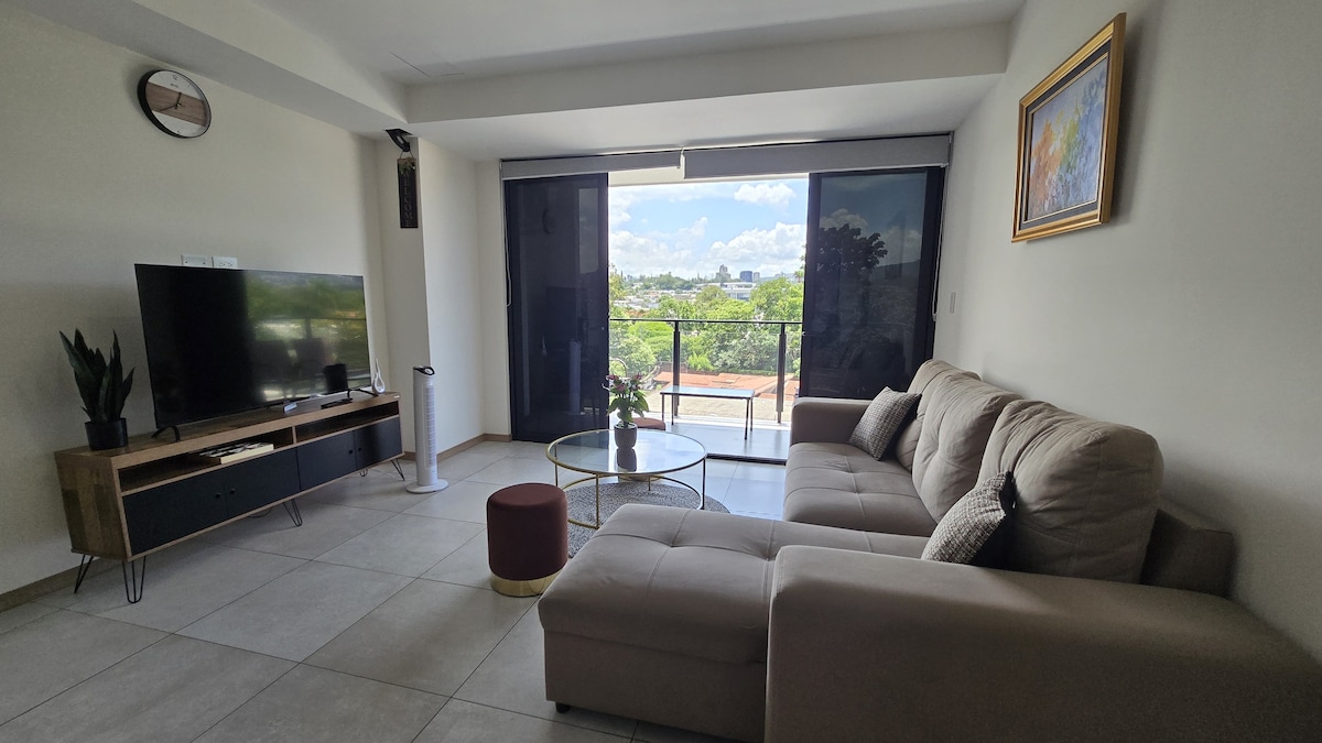 Votre maison moderne à Antiguo Cuscatlán ✨ Séjournez dans un appartement élégant d'une chambre au 11e étage, offrant une vue imprenable sur San Salvador. Parfait pour les voyages d'affaires, les séjours longue durée ou pour disposer d'un pied-à-terre sûr et confortable tout en explorant la ville. Incluant ✔️ Lit king-size en mousse à mémoire de forme, rideaux occultants, bureau et chaise pour le travail à distance. Salon ✔️ moderne avec Smart TV 65", Alexa et canapé-lit (1,70 m). ✔️ Cuisine entièrement équipée Balcon ✔️ privé avec vue panoramique ✔️ Stationnement et Wi-Fi haut débit