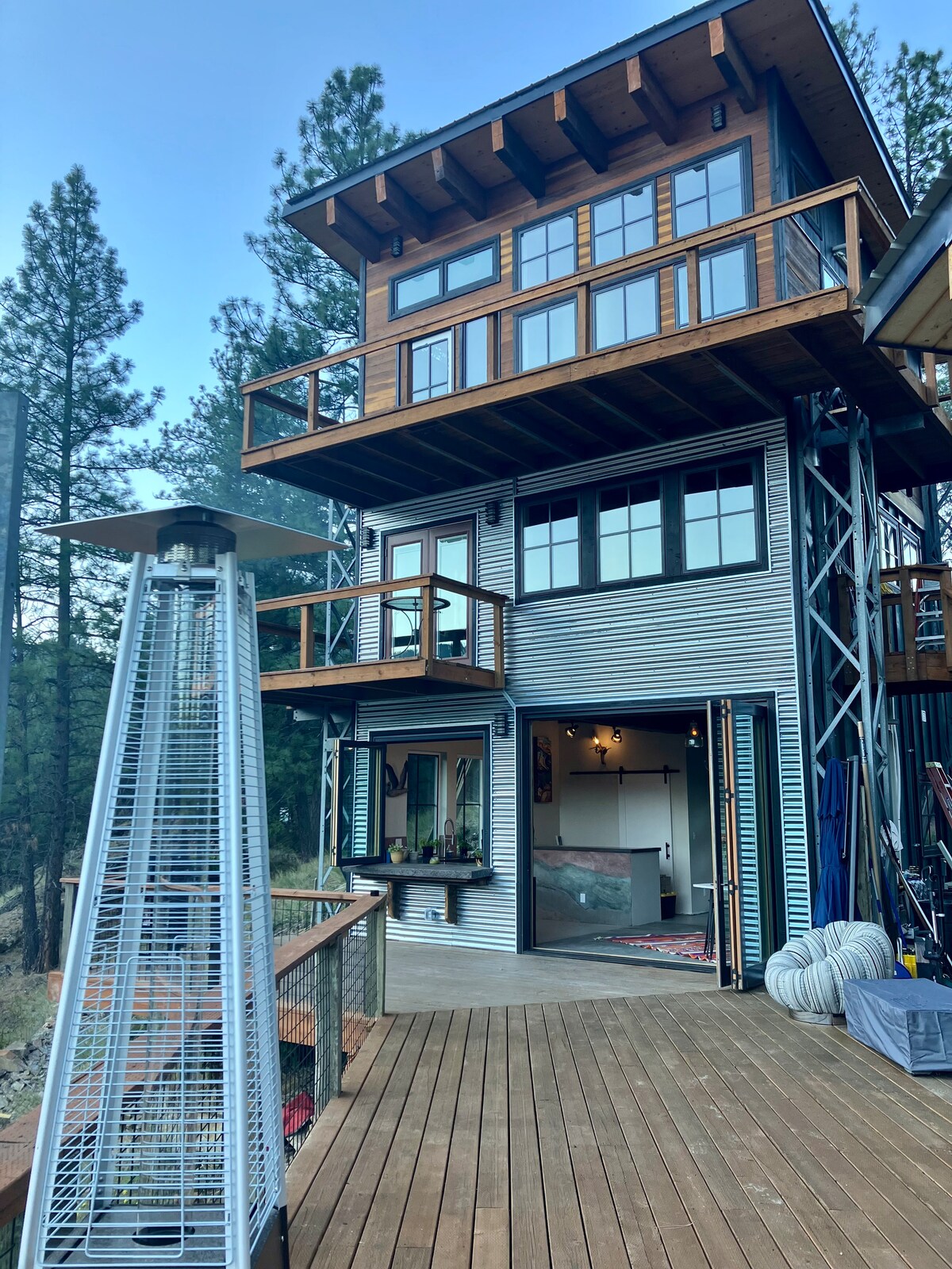 Hangar Quonset dans les bois, vue sur la montagne