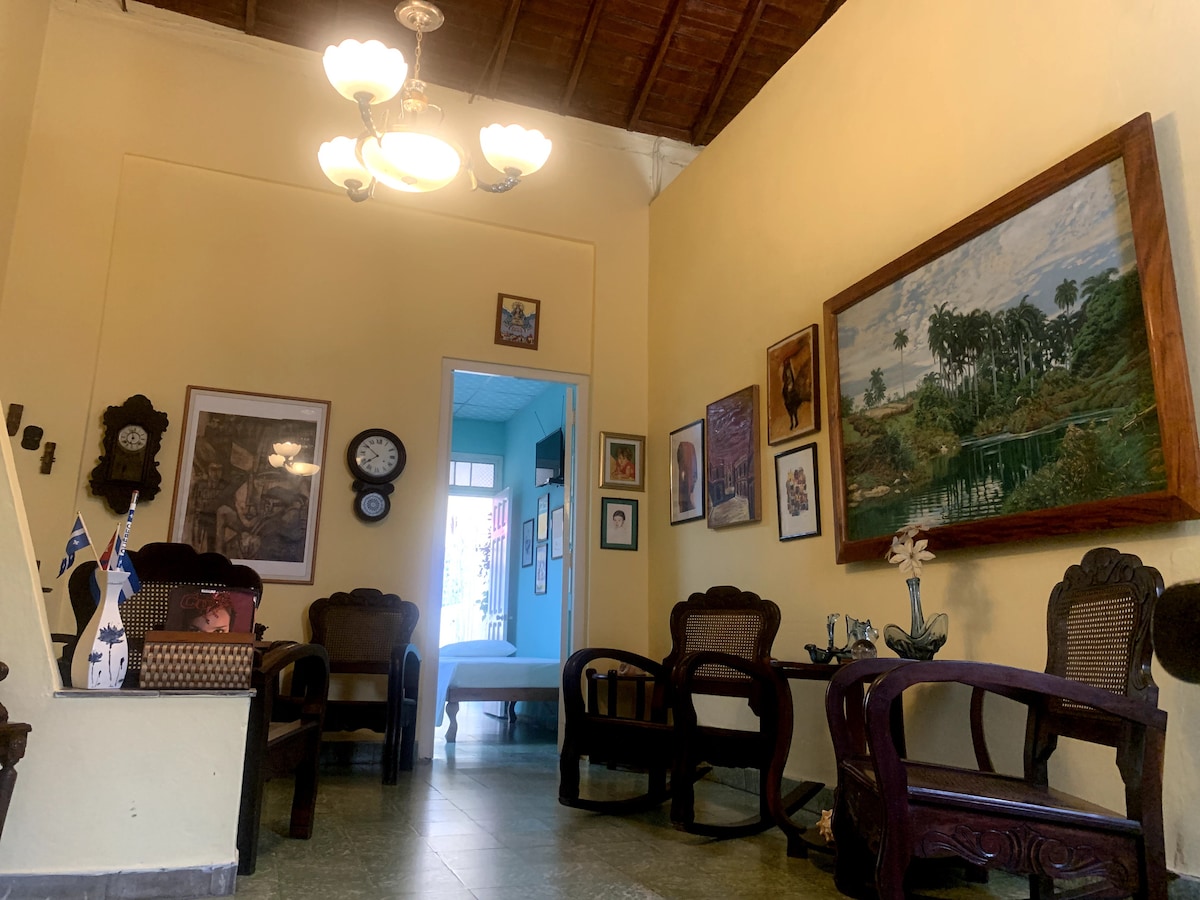 Dans le centre historique de la ville, tout près des restaurants, cafés, bars, du théâtre La Caridad, de la maison de la ville, de la maison de la musique, des musées, du centre culturel El Mejunje, à 20 minutes à pied du mausolée de Che Guevara, se trouve notre logement. La chambre dispose d'un lit double, d'une salle de bains privée, d'une télévision, de la climatisation, d'un réfrigérateur, d'un ventilateur et de miroirs, située en face de la saleta, avec quatre fauteuils, des journaux, des magazines et des livres. Pas de panne de courant à la maison.