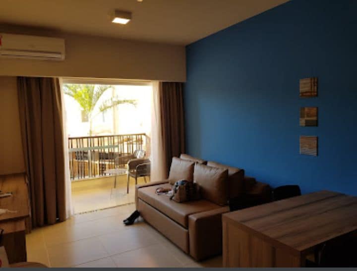 Situé en bordure de Porto Seguro, l'America Praia Apart Hotel, en face de la plage de Taperapuan, dispose d'une piscine extérieure (idéale pour les enfants), d'un jardin, d'un parking et d'une réception ouverte 24h/24. Ils disposent de la climatisation, d'un ventilateur, d'une salle de bain privée, d'une télévision connectée, du wifi, d'un salon, d'une cuisine complète avec micro-ondes, d'un réfrigérateur, d'une cuisinière. Un magnifique balcon avec un hamac. L'appartement en résidence est bien situé avec un Food Truck devant avec plusieurs options alimentaires et avec un marché, une pharmacie à 50 mètres.
