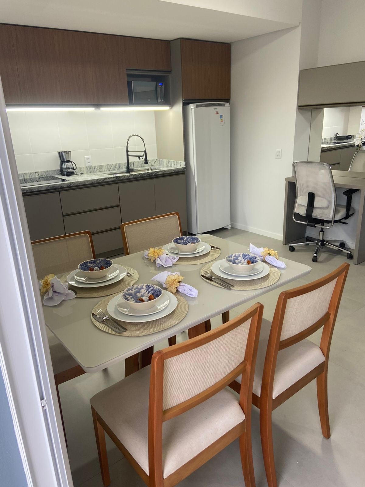 Apartamento novo em andar alto, elevador, chave eletrônica, wi-fi, espaço para trabalho, 2 dormitórios com splits. 2 camas de casal, cozinha planejada com eletros (cooktop, forno, air fryer, depurador de ar, microondas, cafeteira e liquidificador), churrasqueira e lavadora de roupas. Aceita cachorro de pequeno porte. Condomínio lindo de alto padrão, vagas de garagem, portaria 24horas, reconhecimento facial, piscina térmica, sauna, área verde com cascata, espaço holístico e salão de festas.