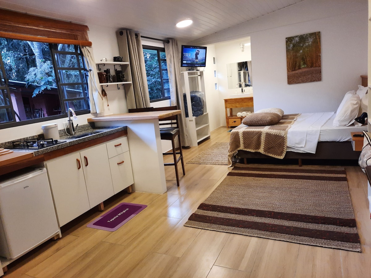 Cabane haut de gamme située dans la zone rurale de São José dos Pinhais sur une propriété sûre, entourée d'une nature incroyable. * Il y a un panier de petit-déjeuner proportionnel au nombre de nuits, panier disponible à l'arrivée. * Détendez-vous dans notre hydromassage interne. * Cheminée * Climatisation * Foyer * Cuisine entièrement équipée (réfrigérateur, grille-pain, plaque de cuisson, four, micro-ondes, cafetière, casseroles et ustensiles). * Télévision connectée. * Internet. * Chauffage au gaz. * Local pour 2 personnes (+18)