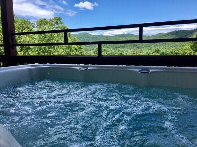 A beautiful mountainside cabin with sweeping views! Features King log bed w/Casper mattress, Queen sleeper sofa & Twin Daybed w/Twin Trundle. Huge Hot Tub makes it feel like a luxury spa! Gas grill on the back porch, overlooking the mountains. Huge 2+ person Jacuzzi w/Waterfall & giant stacked stone mirror. Wood-burning fireplace & fully-stocked kitchen make it like home. Enjoy seclusion, romance and indulgence at its finest!!! We’ll be decorated for Valentine’s! ask about our Romance Packages!