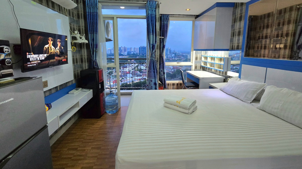 Ce studio entièrement meublé avec une belle vue est parfait pour les voyageurs d'affaires, les visiteurs ou les couples à la recherche d'une escapade confortable. Situé à proximité de JIExpo Kemayoran et du stade international de Jakarta (JIS), il offre un excellent mélange de confort et de commodité. Profitez d'un mode de vie moderne avec un accès gratuit à la piscine, à l'aire de jeux pour enfants et à la salle de réunion. Des restaurants et un mini-marché sont également disponibles dans le complexe d'appartements. Tout ce dont vous avez besoin est à quelques pas.