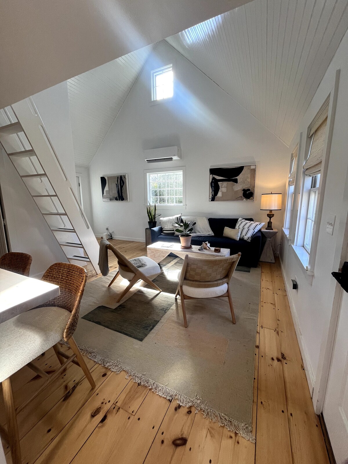 Élégant chalet CLIMATISÉ 'Sconset Center au charme ancien de l'île...peut accueillir jusqu'à 4 personnes ! Privé, en retrait de la rue et entouré de grandes haies. Immaculée, décorée avec des antiquités en pin de campagne. Spacieux avec plafond cathédrale. Cuisine moderne avec comptoirs en granit et micro-ondes. Chambre principale queen size et loft avec deux lits jumeaux. Entièrement équipé avec draps, Wi-Fi, télévision CONNECTÉE 55'', W/D, grande terrasse ensoleillée, chaises de plage, barbecue Weber, douche extérieure et porte-vélos. Très bien ! ! !