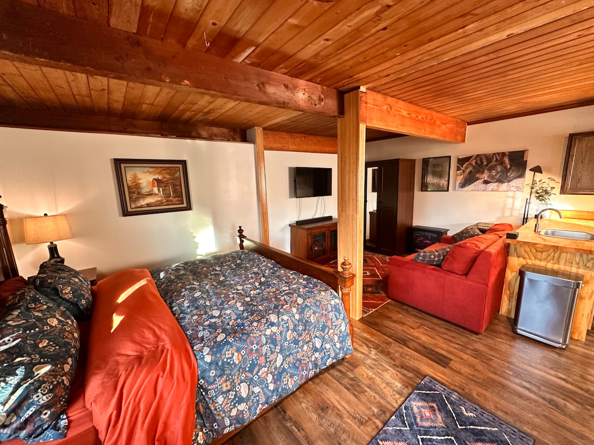 Quiet, clean, self-contained 400 sf studio in a modern home with full bath, kitchen, private entrance and secured parking with EV charger. Comfortably furnished with 1 queen bed, 1 full sleeper sofa, office desk, media center, fridge with ice dispenser, stove, curb-less shower, bidet, washer and dryer. Large sliding glass doors to a patio and 150' high cedar, madrone trees. Effortless access with no stairs or steps. Warm radiant water heated concrete floors, AC and plenty of ventilation.