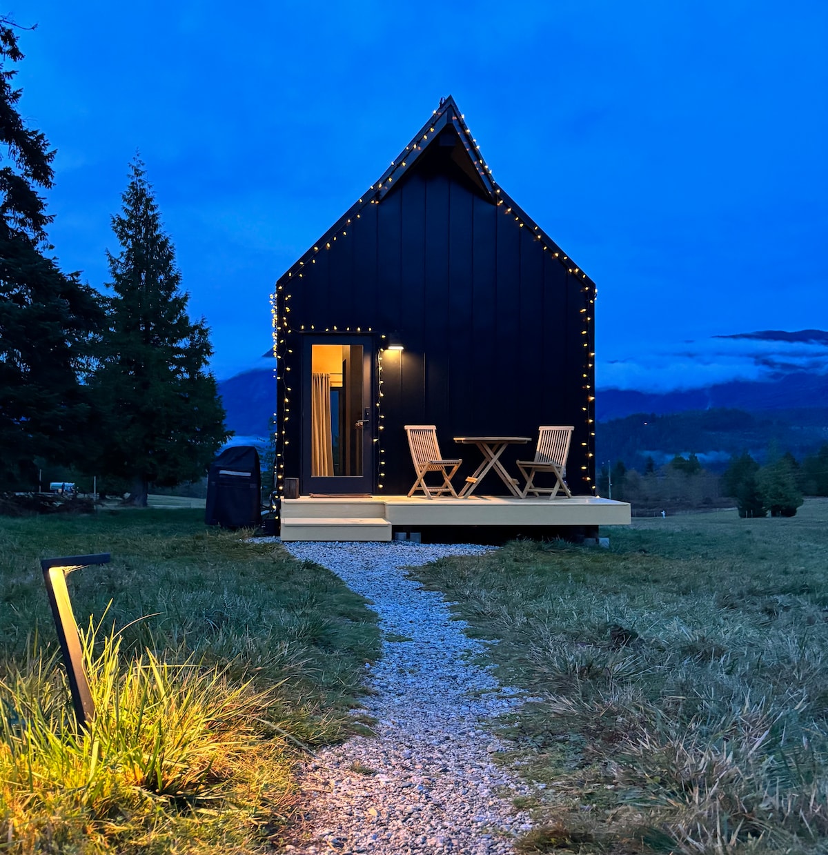 Tout neuf - Vue sur la montagne, l'océan et le ciel - Raven's Hook est une cabane moderne de 300 pieds carrés construite par un architecte, confortable et calme, sur 5 acres de prairies à côté de Sechelt. Elle dispose de plafonds voûtés avec une salle de bain de type spa fermée au centre. Cuisine légère équipée pour cuisiner et barbecue. Dormez comme un loir sur un lit KING ! Détendez-vous près du foyer sur une terrasse privée. Vue fantastique sur l'océan, les montagnes et les champs verdoyants ! Observation des étoiles incroyable ici. Faune abondante : élans, aigles, observation des oiseaux. C'est le paradis !