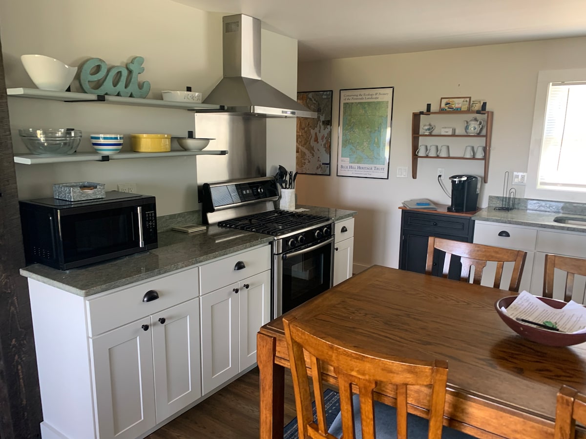 Maison de plain-pied récemment terminée à proximité de tout à Blue Hill. Le concept de plancher ouvert, les grandes fenêtres et la vue sur Blue Hill depuis le porche avant en font un endroit confortable où passer du temps ou une base pour des excursions d'une journée. Tout est à portée de main, que ce soit un court trajet en voiture, une belle promenade à pied ou à vélo, y compris les sentiers de randonnée, l'océan, la montagne Blue Hill, les restaurants, un café et des boutiques, ainsi que le Blue Hill Co-Op et Tradewinds pour vos besoins en épicerie.