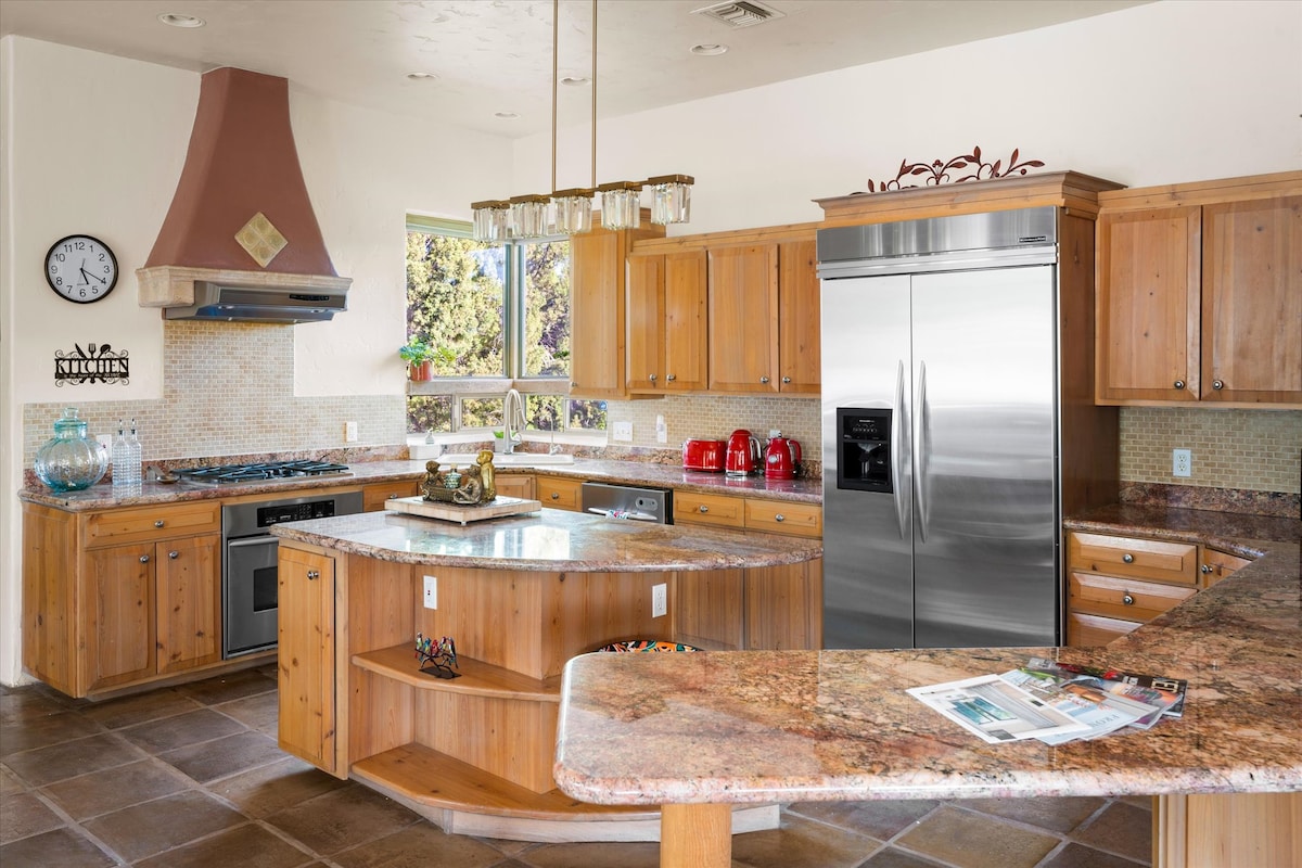 Découvrez le vortex de la chapelle ! Ce chef-d'œuvre conçu sur mesure offre des plafonds hauts et d'immenses fenêtres vitrées qui mettent en valeur les montagnes spirituelles de Red Rock à Sedona. Récemment rénové, l'escapade 3 chambres/3 salles de bain comprend un salon spectaculaire, une cuisine de chef, une salle à manger, un bureau, deux suites parentales romantiques. L'une s'ouvre sur une cour arrière magnifiquement aménagée avec gazon, jacuzzi, barbecue et fontaine/étang relaxant. Un escalier circulaire mène à une suite loft privée et à une grande terrasse d'observation des étoiles. La randonnée commence juste devant la porte d'entrée !