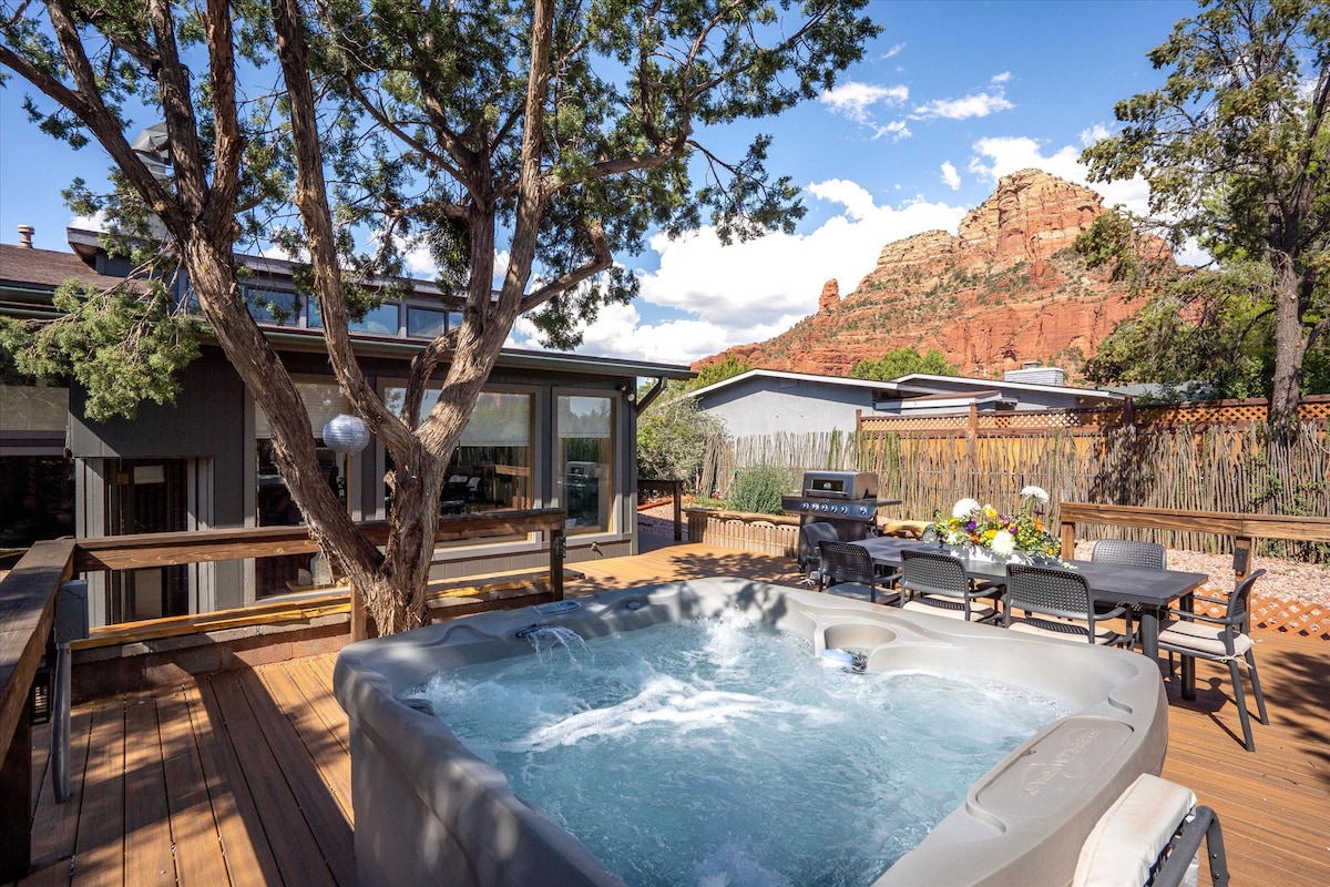 Découvrez Sedona avec style dans cette superbe et toute nouvelle retraite paisible de 3 chambres ! Cette maison spacieuse, qui offre TROIS lits king size, dispose également d'un vaste patio, d'un jacuzzi privé et d'un foyer, le tout avec une vue imprenable sur les montagnes emblématiques de Red Rock. Détendez-vous dans la baignoire après une journée sur les sentiers. Idéalement situé à proximité des meilleures randonnées, restaurants et attractions de Sedona, ce logement offre le mélange parfait de confort, de paysage, de sérénité et de commodité pour votre escapade dans le désert !