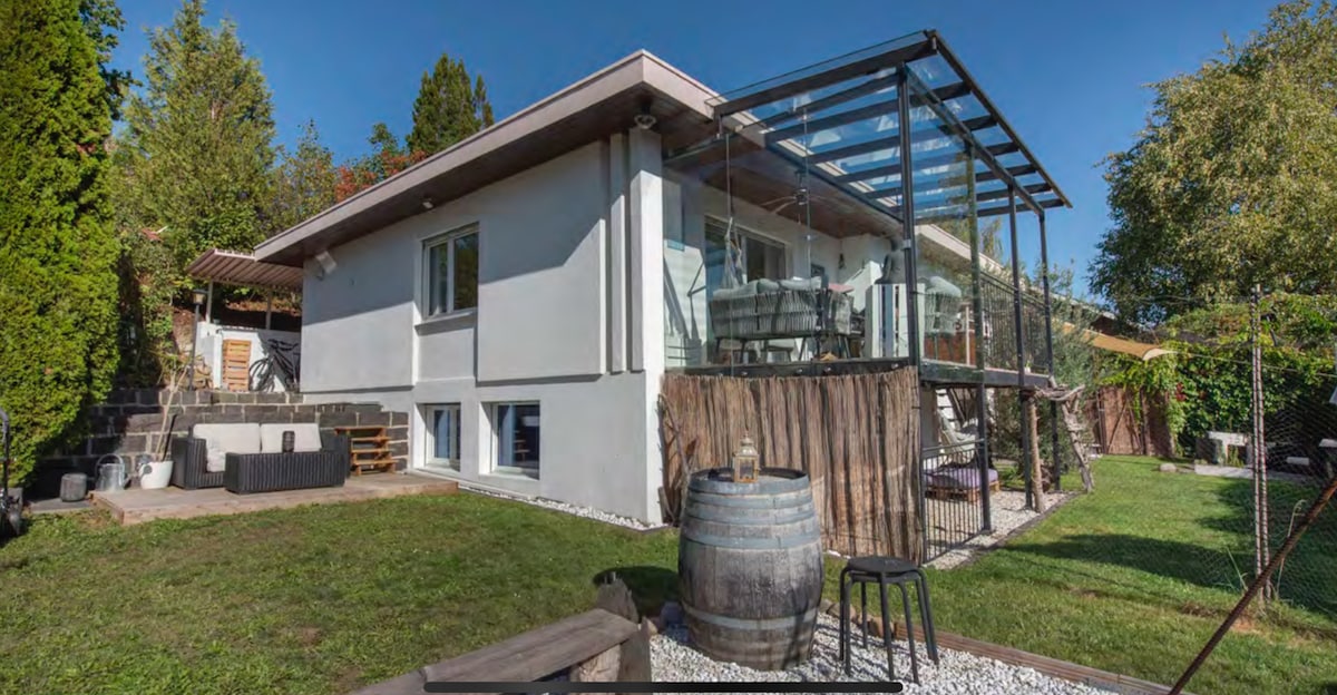 Notre logement moderne et baigné de lumière avec des baies vitrées offre une vue spectaculaire sur le lac. Profitez de l'accès direct à l'eau et laissez-vous envoûter par l'atmosphère calme et les couchers de soleil inoubliables. Le décor créatif, bohème et rustique allie espace, confort et style. Que ce soit pour une escapade romantique ou une pause créative – vous trouverez ici le refuge parfait.