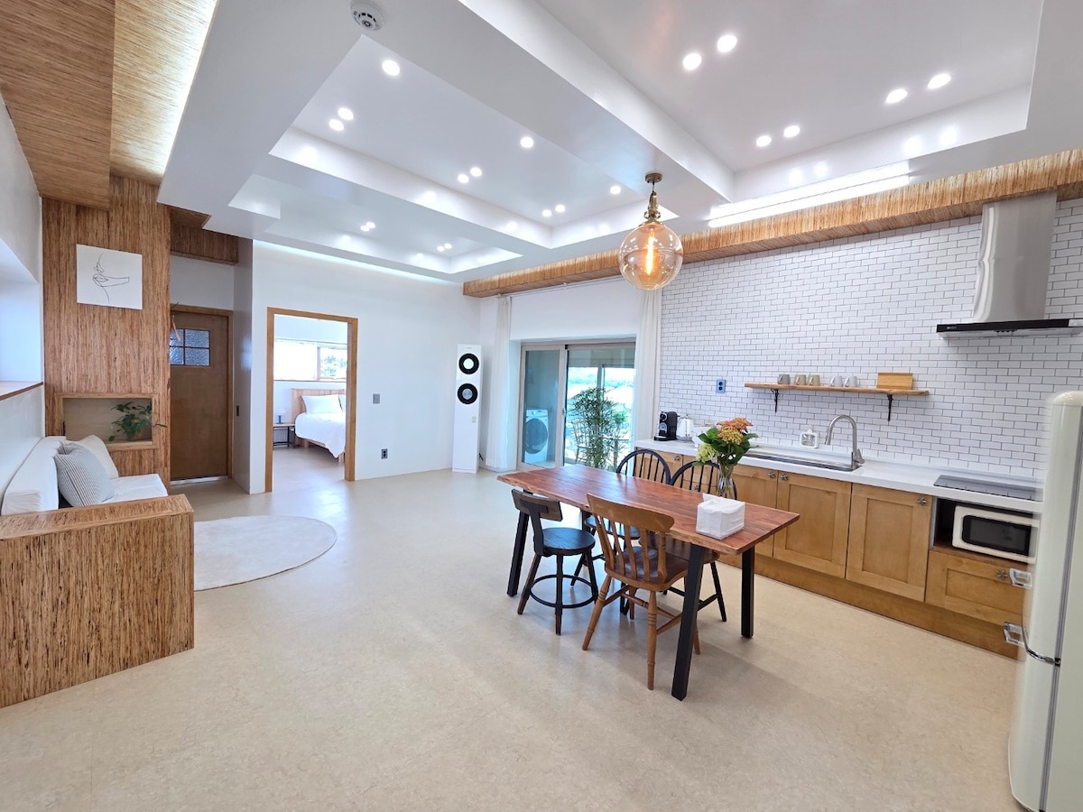 5 minutes à pied de la mer de Sehwa. 5 minutes à pied de l'arrêt de bus.Bien situé, dans un village calme mais avec les commodités modernes. Il y a aussi des installations pour cuisiner, comme une cuve d'eau et une induction, ce qui en fait un très bon endroit pour vivre pendant une semaine. Si vous voulez vivre à Jeju pendant une semaine dans un endroit calme et beau, n'hésitez pas et choisissez-le ~ ^ ^ À l'origine, j'ai utilisé du bois massif pour le construire moi-même, et la table à manger est également en bois massif. La fenêtre du salon est large et bien éclairée, donc si vous vous asseyez sur le canapé et écoutez de la musique avec une tasse de thé, c'est vraiment un régal pour les yeux!! Recommandé pour les voyageurs en couple ou seuls. Le musée Haenyeo et la mer de Sehwa sont accessibles à pied. Le marché aux huiles est ouvert à proximité, et il y a des sites touristiques célèbres tels que Bijarim, Seongsan Ilchulbong Peak, Manjanggul Cave, Labyrinth Park, Woljeong Beach, Cheonseo Dojaeji, Wolrangbong Peak et Jimibong Peak à 10-20 minutes en voiture. Il est également bon de visiter les plages de Wudona Gwangchigi et Seopjikoji. Nous attendons avec impatience de bonnes personnes avec enthousiasme ~ ^ ^