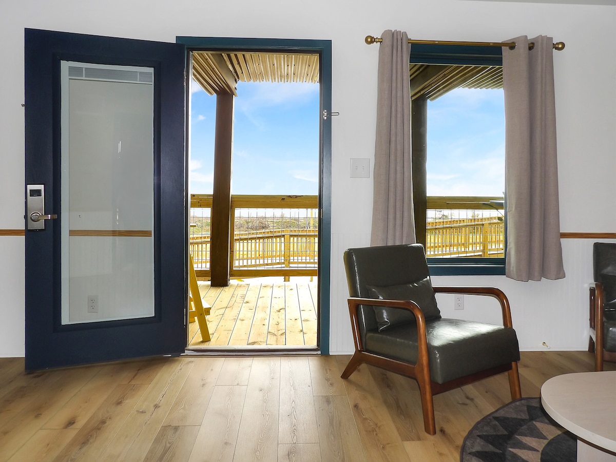Each beachfront suite features 2 private expansive decks, a king bed, a queen-size sleeper sofa, and kitchen amenities- R/O water, a fridge/freezer, airfryer/microwave, induction cooktop and Keurig coffee maker. Accommodating up to 4 adults or 2 adults and 3 children, these rooms offer Gulf and Bay views and easy beach access. No daily housekeeping but you may request a cleaning and fresh towels and linens. Smoking not permitted inside the hotel rooms.